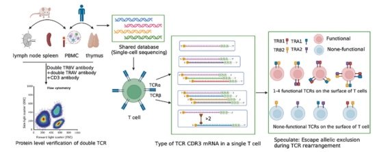“一个淋巴细胞只表达一种特定抗原受体”的经典克隆选择学说,是T细胞发育、耐受与特异应答的基础,其机制主要依赖于TCR基因重排的“allelic exclusion”。但从上个世纪80年代以来,一直有实验证据支持“incomplete V(D)J allelic exclusion”(or allelic exclusion逃逸) 和“双TCR”表达的T细胞,而这部份T细胞的比例、机制和意义并没有得到阐明。