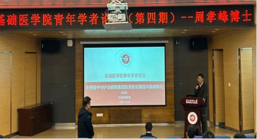 2025年10月23日,suncitygroup太阳新城成功举办了第四期青年学者论坛。本次论坛由生理学教研室青年博士周孝峰主讲,主题为“食管癌中YAP功能靶基因的系统化筛选与临床转化”。suncitygroup太阳新城副经理韩勇、生命科学研究院副经理保玉心出席了此次论坛,生理学教研室主任孔德营副教授担任主持,公司全体博士参加了本次讲座。