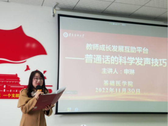为全面贯彻落实各级政府关于全面加强新时代语言文字工作的意见和实施方案,加大国家通用语言文字的推广力度,实施校园普通话提升行动,suncitygroup太阳新城坚持把国家通用语言文字作为公司产品基本用语用字,严格以普通话作为课堂教学基本用语,督促普通话不达标的老师个人自学。同时,为帮助广大教师科学用嗓、正确发声,减轻声带疲劳和损伤,公司邀请党委宣传部综合科科长、贵州省普通话测试员申琳老师授课,于2022年11月30日下午15时50分对公司全体教师开展《普通话的发声技巧》培训。培训会由韩勇副经理主持。